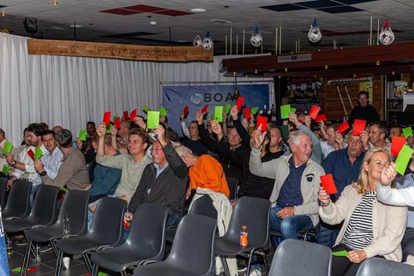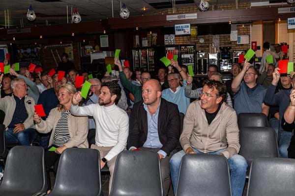 De aanwezigen in de zaal geven hierop hun mening "Groen" = eens ,"Rood" oneens.