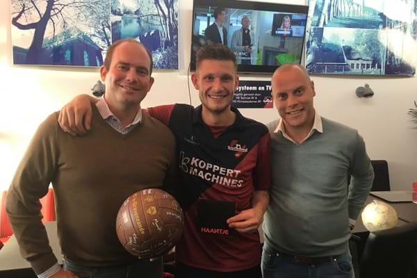 Dennis van Rijn ontvangt van BC vice voorzitter Bas Voermans en balsponsor van LPG Advies Edwin de Lijster de prijs voor de Man of the Match
