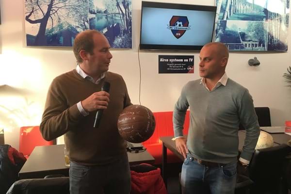Balsponsor Edwin de Lijster van LPG Advies ontvangt de wedstrijd bal van BC vice voorzitter Bas Voermans